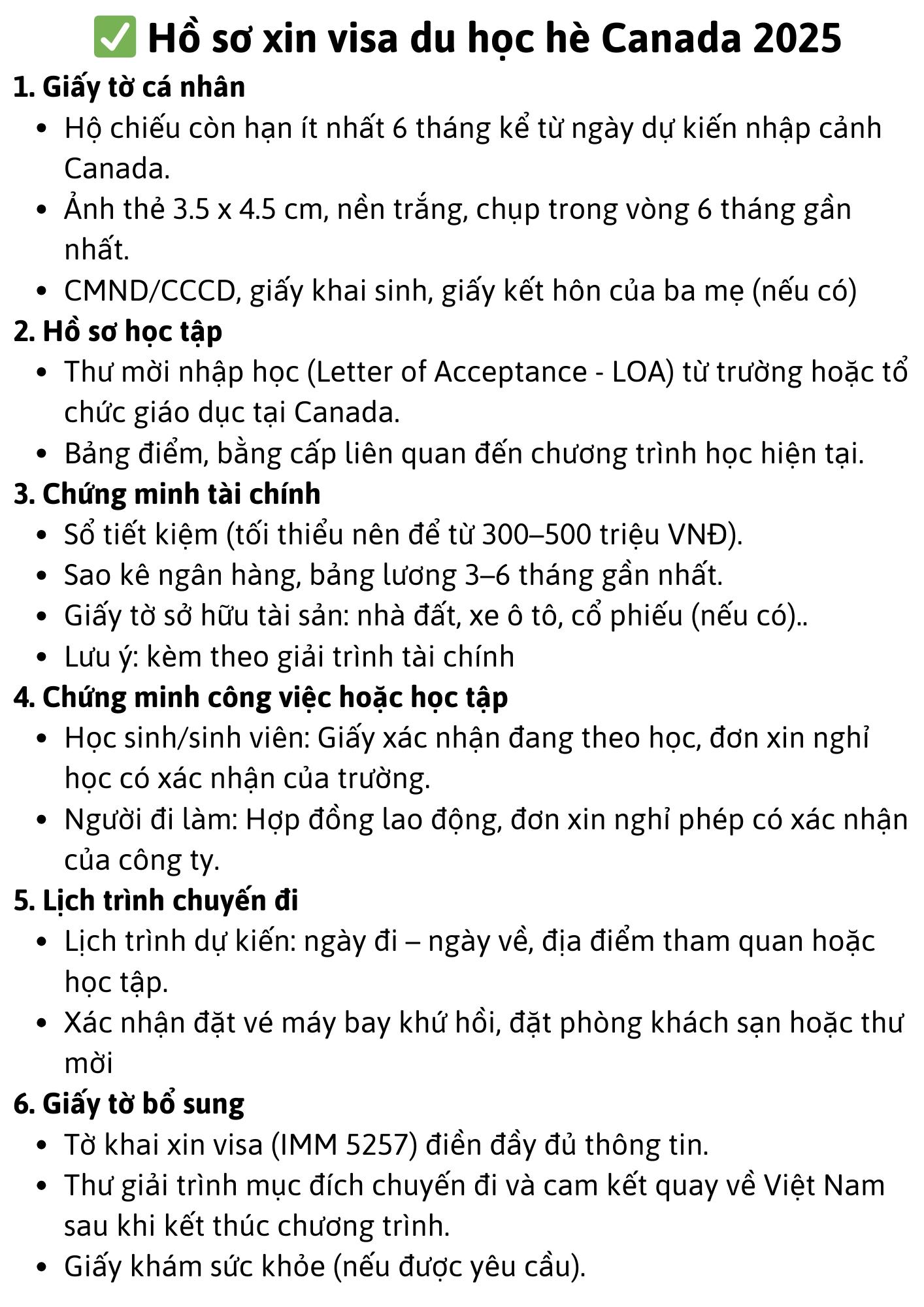 Hồ sơ xin visa Canada có thể phức tạp và yêu cầu nhiều tài liệu khác nhau tùy thuộc vào loại visa bạn đang xin (du lịch, công tác, thăm thân, học tập, làm việc, etc.). Dưới đây là một số tài liệu cơ bản mà bạn có thể cần chuẩn bị: